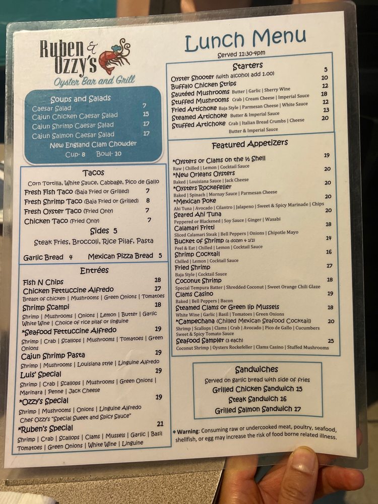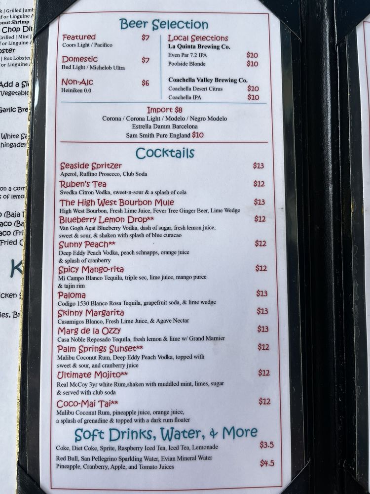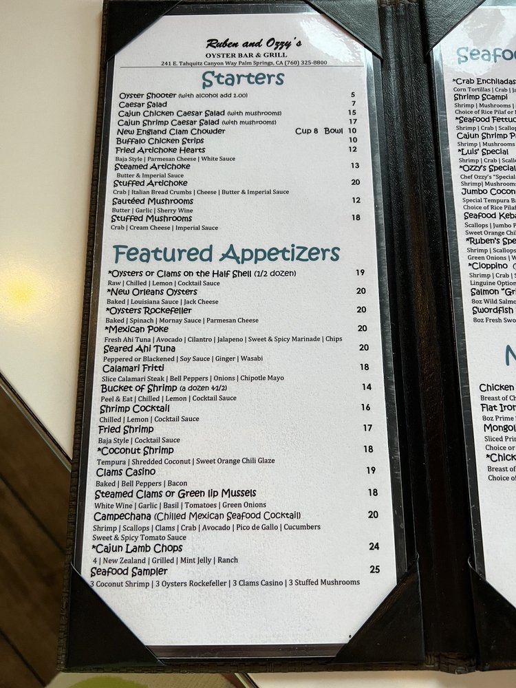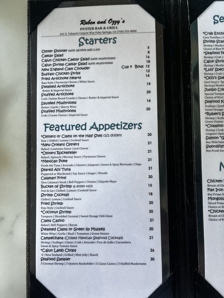 If you're in Palm Springs and craving fresh seafood, look no further than Ruben and Ozzy’s Oyster Bar & Grill. This hidden gem offers a wide range of options, from jumbo cocktail shrimp to mouthwatering oysters. The intimate setting and Baja-style ambiance make for a cozy dining experience, whether you're inside or enjoying the misted patio seating outside. Dishes like grilled fish tacos and New Orleans oysters will satisfy any seafood lover, while options like coconut shrimp and linguine alfredo cater to diverse tastes. The portions are generous, the service is top-notch, and the owners' commitment to quality shines through in every bite. Don't miss out on the happy hour deals, and be sure to try the jumbo cocktail shrimp and the baked oysters for a truly unforgettable meal. Ruben and Ozzy’s Oyster Bar & Grill is a must-visit for seafood enthusiasts looking for a culinary delight in the heart of Palm Springs.
